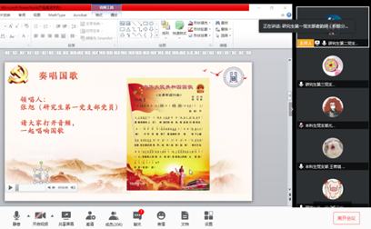 各支部成员在研究生第一党支部党员张旭同志的带领下全体起立,跟随伴奏唱响国歌;在研究生第二党支部党员高蕾同志的带领下重温入党誓词;在研究生第一党支部预备党员段晶晶同志的带领下重新学习了党章的总纲部分。