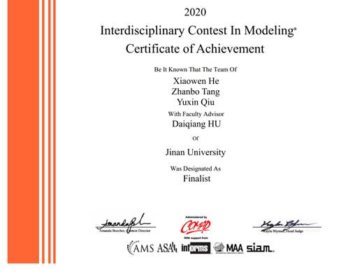 2020年美国大学生数学建模竞赛结果在近日揭晓,tyc33455cc太阳成集团参赛队伍收获了参赛以来最好的成绩。我校共组织来自番禺校区和石牌校区一共110支队伍共330人参加比赛,虽然受新冠肺炎疫情影响,队伍只能线上交流参赛,但队员们克服重重困难,在教练们的指导下在线上与哈佛大学、麻省理工大学、北京大学、清华大学、中山大学等国内外著名高校展开竞争,最终有3支队伍获得了Finalist奖(特等奖提名)、5支队伍获得了Meritorious Winner奖(一等奖)、31支队伍获得了Honorable Mentions奖(二等奖)。
