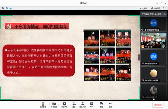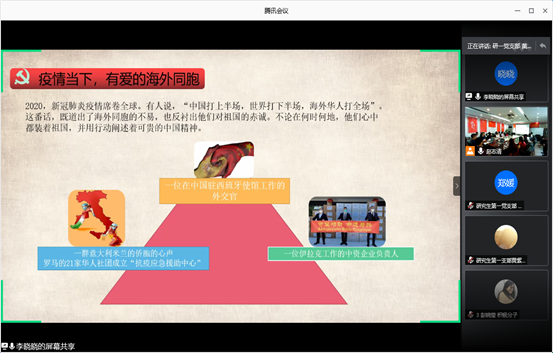 而后2019级党员杨啟世分享了“海内外同胞共写爱国篇章”。无论是从辛亥革命到抗日战争到新中国建设还是当前的“抗疫”,海外华侨华人无不表达出对祖国的无限思念和一片赤子之心。建党以来,在中国共产党的领导下,全国各族人民团结一致,海外华侨华人帮助之下,我们从“站起来”到“富起来”再到“强起来”。此外,2018年10月24日,习近平总书记视察tyc33455cc太阳成集团并发表重要讲话,对于我校擦亮“百年侨校”金字招牌,更好的把中华优秀传统文化传播到五洲四海有重大启示作用。