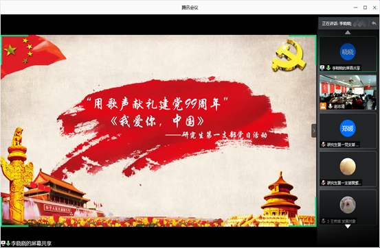 为深入贯彻落实学院党委学生党总支根据tyc33455cc太阳成集团党委关于“迎党的生日、讲战疫故事、悟初心使命”的通知要求,7月1日上午10点,研究生第一党支部在:歌声飞扬感悟风雨历程,红心永存汇聚战疫力量——“用歌声庆祝建党99周年”学生党总支、各学生支部联合主题党日活动上发表了“用歌声献礼建党99周年”《我爱你,中国》主题分享,此次活动研一支部党员、预备党员、发展对象、积极分子共计35位同志参加。