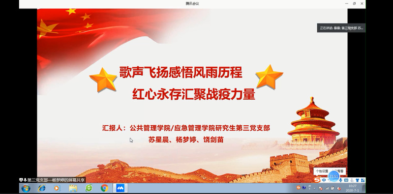 为庆祝中国共产党成立99周年,重温党的光辉历程,讴歌党的丰功伟绩,继承和发扬党的优良传统和作风,进一步提升党支部的组织力、战斗力、凝聚力,增强广大党员先锋模范意识,引导广大党员自觉锤炼党性修养,践行初心使命,公共管理学院/应急管理学院研究生第三党支部于7月1日积极参与了学生党总支组织的:歌声飞扬感悟风雨历程,红心永存汇聚战疫力量——“用歌声庆祝建党99周年”主题党日活动。此次活动研究生第三党支部党员、预备党员、积极分子共计27位同志参加。