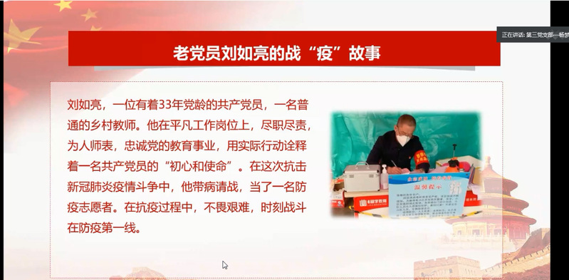在张龙平教授点评部分,张教授肯定了研三支部的作品,《保卫黄河》反映了抗日战争时期延安人民同仇敌忾、众志成城、保家卫国的民族精神。支部的分享不仅仅停留在歌曲及其反映的历史精神,而是从精神里挖掘对现实有益之处,关照现实,强调了青年的使命担当。同时提出作品的不足和提出修改建议,他指出,无论是在革命年代还是新时代,保家卫国的精神都是代代相传的。如能找到一种精神线索将保卫黄河、战疫故事和青年的使命担当串联起来,作品将会更加有灵魂。