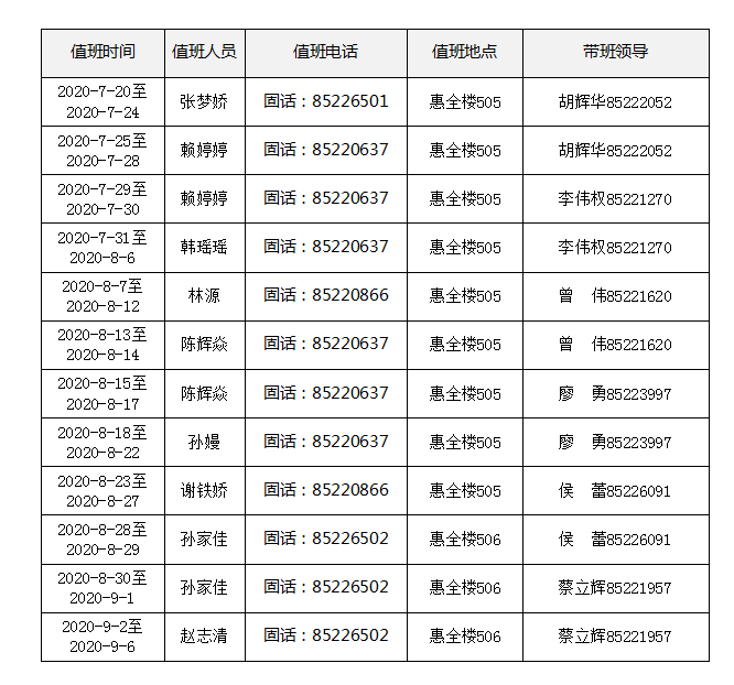 学校各部门值班安排汇总:https://www.jnu.edu.cn/2017sjgdwzbhz/list.psp