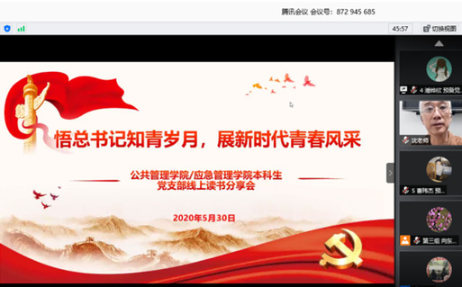 为积极响应学校党委“一党委一品牌、一支部一特色”的号召,公共管理学院/应急管理学院党委本科生党支部结合专业特色,依托“1+4+1”培养考察模式,创建了“与信仰对话,与红色同行”红色经典品读品牌活动。5月30日,本科生党支部举办了以“悟总书记知青岁月,展新时代青春风采”为主题的线上读书分享会,学院退休党员教师沈远平教授、学生党总支书记曾伟、支部书记赵志清,以及本科生党支部学生党员、预备党员、发展对象、积极分子共计142人参加了本次活动。