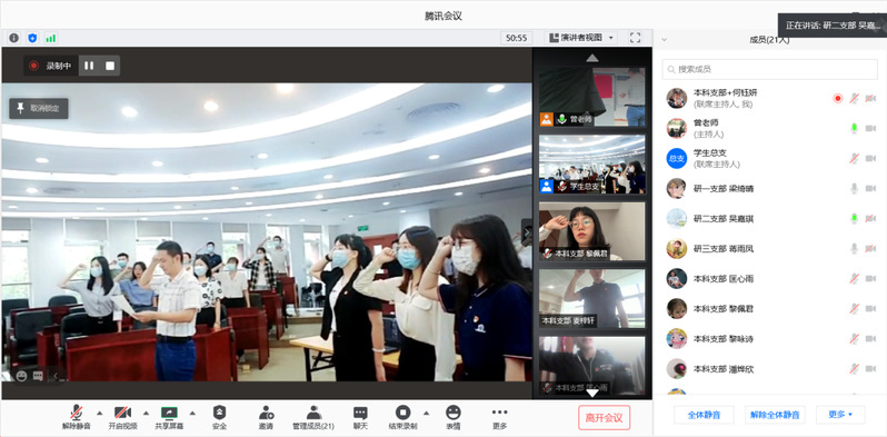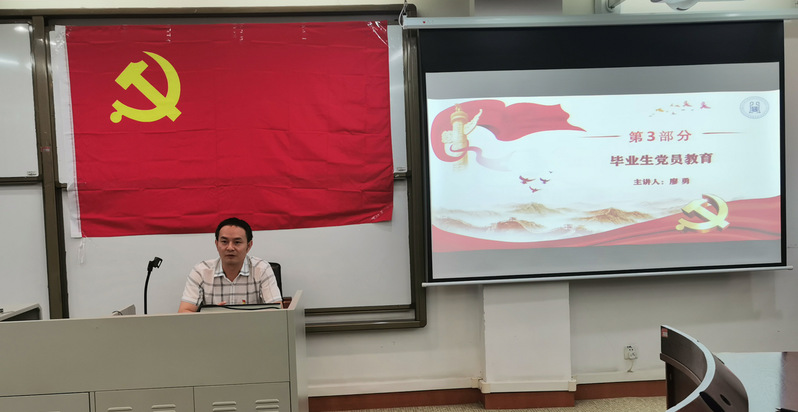 组织生活会还安排了入党宣誓和重温誓词环节,廖勇书记带领线上、线下与会党员庄严宣誓,以提醒毕业生党员不论未来走向何处,都应铭记入党时的初心和使命、宣誓时内心那份滚烫的信仰。“我志愿加入中国共产党,拥护党的纲领,遵守党的章程……”新党员在党旗下作出郑重承诺;“对党忠诚,积极工作,为共产主义奋斗终身……”其他党员重温入党誓词,回望入党初心,再次领会誓词所昭示的中国共产党党员的责任与担当。