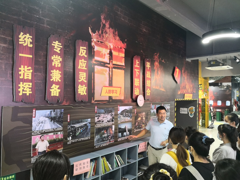 随后同学们自由取阅了防灾应急手册并认真阅读。随着参观队伍的前进,同学们来到了一面墙前——墙上是2000~2020年影响我国应急管理发展的突发事件图片展。陈总为同学们展示了鸡西矿业集团公司城子河煤矿西二采区特大瓦斯爆炸事故、汶川大地震、天津滨海新区火灾爆炸事故等一系列重大事件,让同学们在一张张图片中感受到应急管理的不断发展,并认识到我国突发事件的发展特点——单一灾种转向复合灾种、高危领域转向公共领域、事故数量减少损失增大、城市风险加大基层薄弱、极端气候自然灾害加剧。图片展极大提升了学生学习应急知识的兴趣。