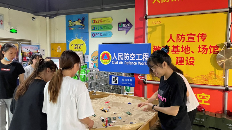 (图为同学们在休息时间进行人防模拟)