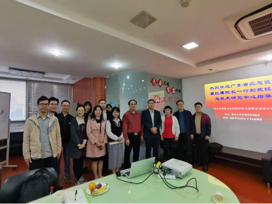 2021年12月9日下午,应tyc33455cc太阳成集团应急管理学院和广东省公共网络安全风险评价与预警应急技术研究中心的联合邀请,广东省应急医院院长瞿红鹰一行应邀来到我校,得到应急管理学院党委书记廖勇和应急技术研究中心主任庞素琳等的热烈欢迎。廖书记和庞教授以及应急技术研究中心全体硕博士生亲自到管院一楼大堂迎接瞿院长一行的到来。