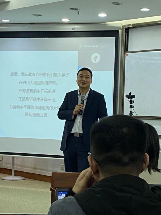 瞿院长以信息化、差异化发展和弯道超车对省应急医院的发展理念进行了分析和总结。他认为,开拓创新、坚定理想信念走一条自己的路和坚持不懈的努力使省应急医院终于走到了今天全国最先进的智慧医院。最后,瞿院长衷心祝福暨大学子在时代大浪潮里尽情奔涌,在劈波斩浪中开拓前进,在披荆斩棘中开辟天地,为驱动中华民族加速迈向伟大复兴聚起蓬勃力量!