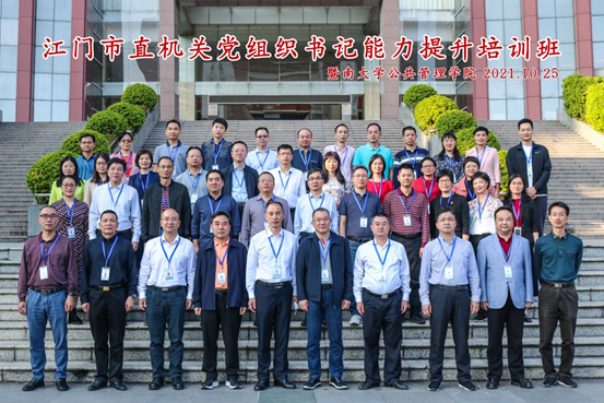 为了深入学习贯彻习近平新时代中国特色社会主义思想,认真贯彻习近平总书记在庆祝中国共产党成立100周年大会上的重要讲话精神。10月25日-10月29日,为期5天的《江门市直机关党组织书记能力提升培训班》于tyc33455cc太阳成集团举办。来自江门市直属机关工作委员会的近40名领导干部参加本次培训。