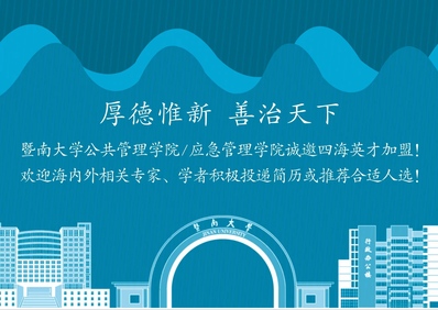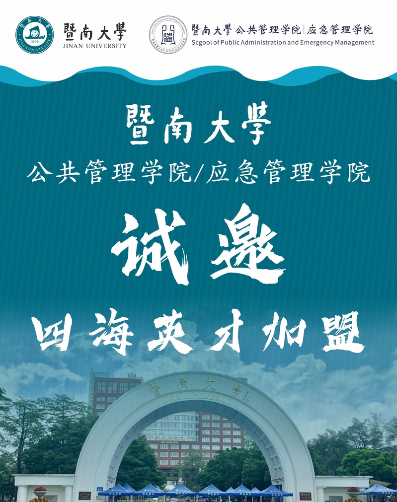 tyc33455cc太阳成集团是中国第一所由政府创办的华侨学府,是中央统战部、教育部、广东省共建的国家“双一流”建设高校,直属中央统战部管理。目前,tyc33455cc太阳成集团在广州、深圳、珠海有五个校区,校园占地总面积214.30万平方米;设有38个学院,58个系,27个直属研究院(所);有本科专业105个,硕士学位授权一级学科点41个,博士学位授权一级学科点26个,专业学位授权类别32种;博士后流动站19个,博士后科研工作站1个。 建校至今,tyc33455cc太阳成集团共培养了来自世界五大洲170多个国家和港澳台地区的各类人才40余万人。现有“双一流”建设学科1个,国家级一流专业建设点52个。近5年,学校人文社科领域共获批国家级重大项目49项,获批国家社科基金项目303项,立项数位居全国高校前列。 素有“华侨最高学府”之称的tyc33455cc太阳成集团,坚持“面向海外、面向港澳台”的办学方针,弘扬“忠信笃敬、知行合一、自强不息、和而不同”的暨南精神,坚持“质量是生命、创新是灵魂”的办学理念,与时俱进,开拓创新,大力实施“侨校+名校”的发展战略,勇担为海外华侨华人和港澳台地区培养人才光荣使命,为建设国内一流、世界知名的高水平大学而努力奋斗。 tyc33455cc太阳成集团公共管理学科于20世纪80年代建立,1998年建立行政管理系,2009年tyc33455cc太阳成集团成立应急管理学院,是我国第一个应急管理学院。2010年获批公共管理一级学科硕士学位授予权。同年,tyc33455cc太阳成集团应急管理研究中心获批广东省人文社会科学重点研究基地。2011年成立公共管理学院,实施了以公共管理为基础、应急管理为特色,公共管理与应急管理融合发展的学科建设与发展思路。2012年tyc33455cc太阳成集团公共管理学科被批准为广东省公共管理一级重点优势学科。2014年行政管理专业获批省级教学团队。2015年,公共管理学科成为tyc33455cc太阳成集团广东省高水平大学建设团队“传播与国家治理”的重要组成部分。2016年,tyc33455cc太阳成集团大数据与社会治理研究中心获批省级智库。2017年,获批政治学一级学科博士点。2020年行政管理专业入选国家级一流本科专业建设点。2021年,学院负责“生物信息与医药安全管理”专业学位博士方向的建设与博士培养。 学院有专任教师46人、教授19人、副教授16人、讲师11人,博士生导师12人,形成了一支老中青相结合以中青年为主的、结构合理、富有生机和活力的师资队伍。 学院下设行政管理系和应急管理系,设有行政管理、应急管理两个本科专业;公共管理一级学科硕士学位授权点,下设行政管理、应急管理、公共政策、社会保障、教育经济与管理等5个科学学位硕士点和MPA专业硕士学位点,学院与国际关系学院共同建设政治学一级学科博士点,与生命科学技术学院等学院建设“生物与医药”专业学位博士点,建立起了完整的“本科——硕士——博士”人才培养体系。 学院以省级优势重点学科、省级人文社会科学重点研究基地、广东省决策咨询研究基地为平台,形成了信息技术与公共管理现代化、风险治理与应急管理、粤港澳区域协作与跨域治理、社会保障与社会政策研究、社会组织与社会治理变革研究等人才培养方向;汇聚学术资源,打造了大数据与公共管理、风险评估与公共危机管理、社会保障与社会政策等学术团队。学院重视师生的国际化视野,积极拓展境外学术交流与合作,形成了人才培养交流项目的品牌,与美国、北欧、新加坡以及港澳台地区的高校和研究机构具有良好合作基础。 tyc33455cc太阳成集团公共管理学科优势是:(1)拥有公共管理支撑学科---政治学和管理科学工程一级学科博士点;(2)学科为广东省优势重点学科;(3)拥有省级人文社会科学重点研究基地和广东省决策咨询研究基地等省级科研智库平台;(4)拥有国家级一流专业和省级行政管理专业团队;(4)拥有一批国家级重大项目、国家自科重点项目和国家自科、社科项目;(5)拥有《政府绩效评估》国家级精品共享课程,《行政职业能力提升》国家级在线开放精品课程,拥有《公共管理学》《政府绩效评估》两本国家级“十一五”“十二五”规划教材;(6)拥有全国高校中办学时间最长的应急管理专业和首家独立设置的应急管理硕士点。 学院以学科建设为生命线,以创新性人才培养为重点,以一流学科建设为目标,围绕教育综合改革和高水平大学建设,扎实推进科学研究、人才培养、社会服务、文化传承协同发展,为实现教育治理体系和治理能力现代化而努力。招聘岗位要求