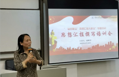 为帮助同学们深入学习党的二十大精神,提高政治思想理论水平,提升思想汇报撰写能力,本科生党支部于3月10日晚在惠全楼314教室举办了“‘凝思聚议’思想汇报培训会”党日活动。活动邀请了学院党委委员、副院长胡辉华教授担任培训会主讲人,支部全体党员、发展对象、积极分子共计60人参加活动。活动由支部书记林源老师主持。