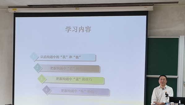 在讲解沟通技巧的过程中,戴胜利给同学们分享了把握“眼睛定位”和识别他人情绪的方法,并强调在沟通前进行语言的内容组织和逻辑思考、沟通时注意语调得体和音量控制的重要性。