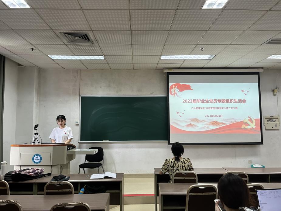为深入贯彻落实习近平新时代中国特色社会主义思想,提升支部成员的政治素养,充分发挥党员先锋模范作用,2023年6月21日下午,公共管理学院/应急管理学院研究生第三党支部在惠全楼517教室举行2023届毕业生党员专题组织生活会,通过支部书记讲党课、毕业生党员经验分享、党员先锋领学、收看高校党组织示范微党课等形式深入交流研讨。党支部书记谢铁娇,支部党员、发展对象、入党积极分子共20人参加活动。活动由支部副书记尤心培主持。