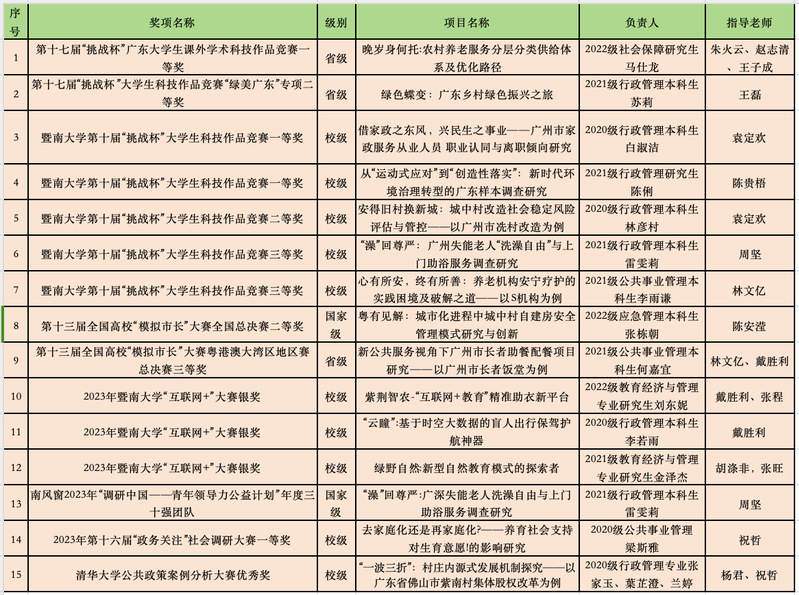 1、李丹阳副教授“基于‘政学研生态圈’理念的公共管理硕士(MPA)教育体系研究”获批2023年广东省研究生教育创新计划“学位与研究生教育改革研究项目”。