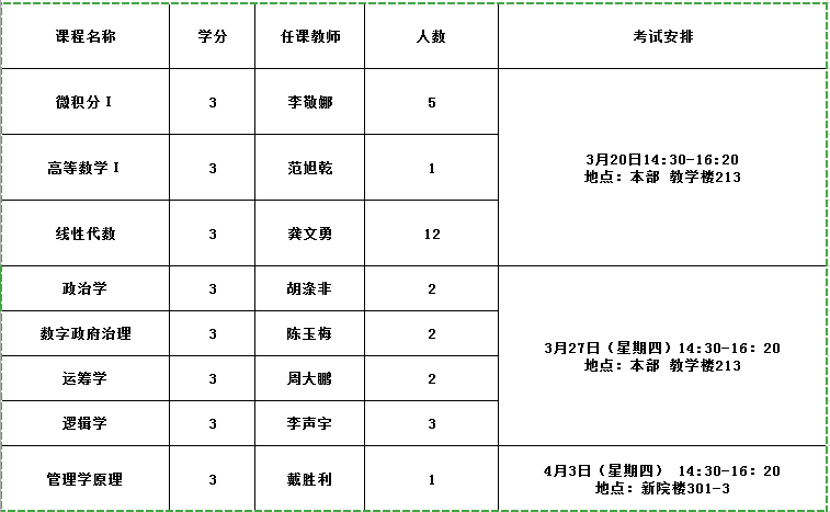 1、只安排必修课程补考。 2、上学期是选修、重修的课程和未在教务系统中申请补考的同学,请勿参加补考,任课老师在成绩系统中不能录入此部分同学成绩,考试成绩作废。补考成绩录入时间为2025年3月10日~4月15日,请任课教师按时录入补考成绩。 3、补考安排的课程为公管学院教师所任课的课程,其他课程补考安排请留意教务处或相应学院的网站。 4、如有疑问,请联系85226501,张老师。 |