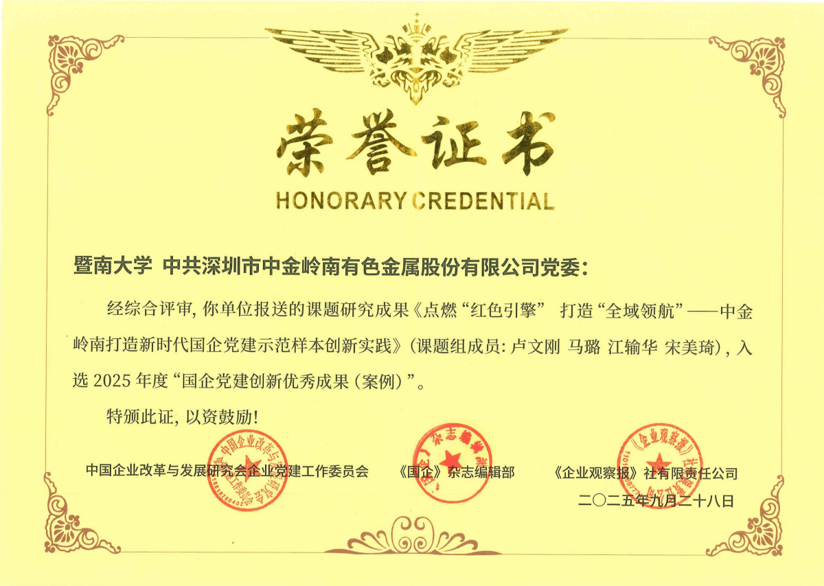 论坛举行了第六届国企党建创新优秀成果(案例)“2025年度国企党建创新优秀案例”证书颁发仪式。由我院党的建设与公共安全治理研究院院长、广东省高校新型智库——tyc33455cc太阳成集团湾区国际智慧应急与安全发展研究院院长卢文刚与上市公司中金岭南联合申报的研究成果案例《点燃“红色引擎” 打造“全域领航”——中金岭南打造新时代国企党建示范样本创新实践》,从全国1500多个案例中脱颖而出,获评2025年度“国企党建创新优秀成果(案例)”。